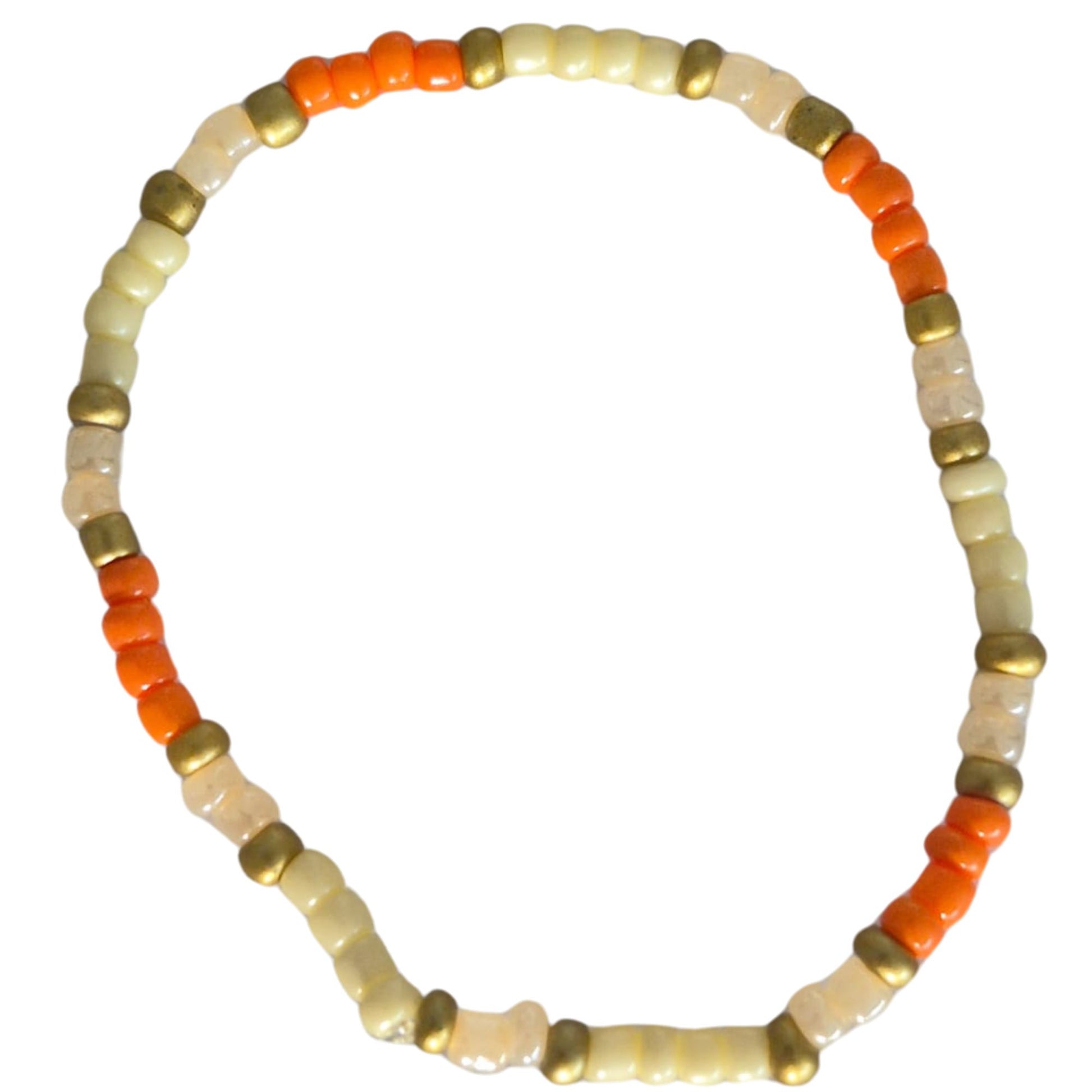 Dieses handgemachte Perlenarmband in warmen Orange-, Gold- und Creme-Tönen erinnert an einen Sonnenuntergang am Strand. Die Mischung aus glänzenden und matten Perlen verleiht dem Armband einen natürlichen Look – ideal für jeden Tag!